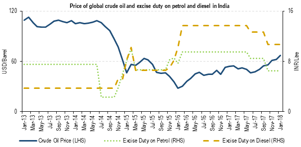 The Government of India has used the reducing price of crude oil as an opportunity to raise its revenue by pocketing the majority of the reduction in price by increasing its taxes on the fuel. It’s further evident by comparing the crude prices to the excise duty on petrol & diesel prices.